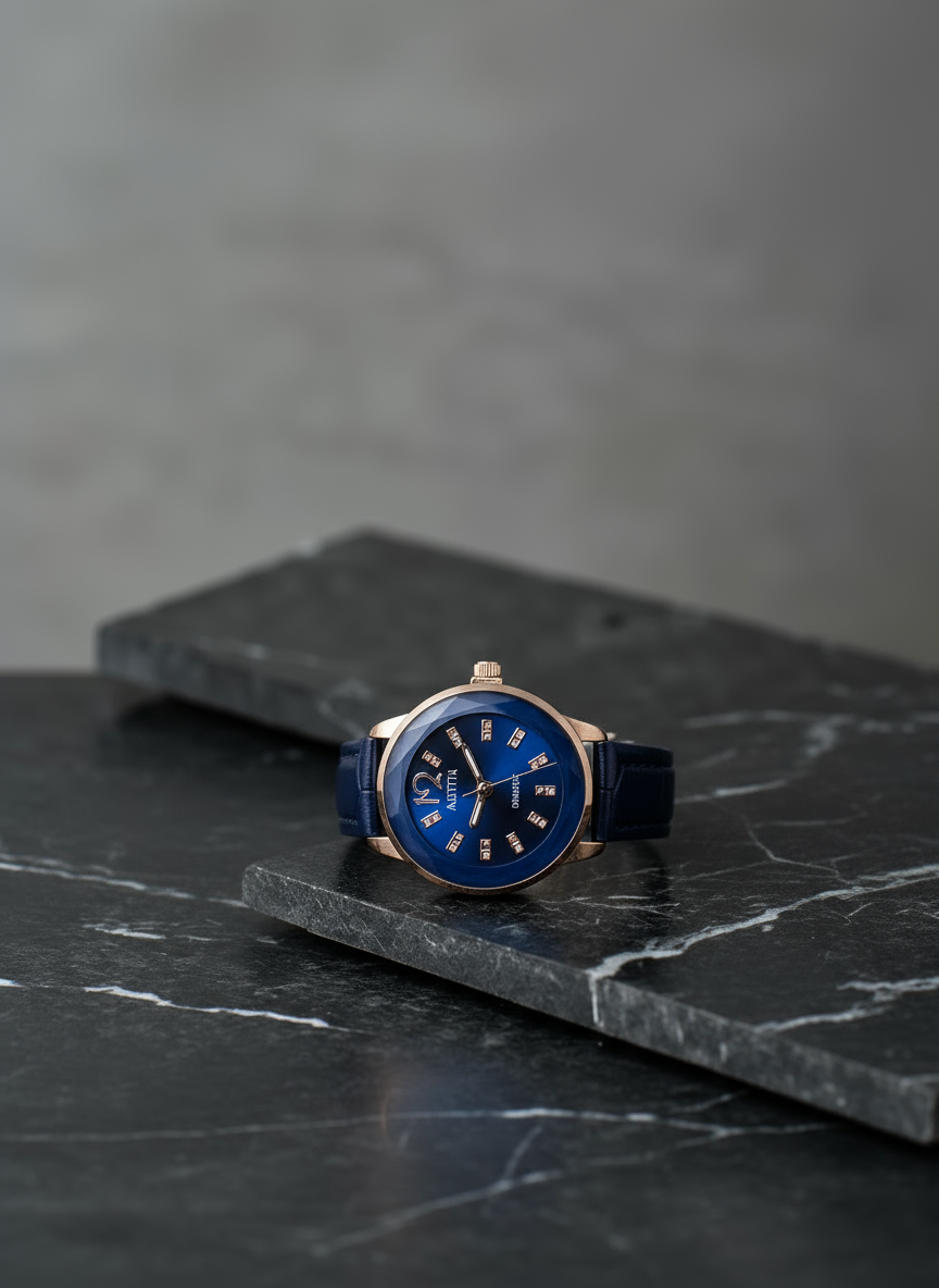 • نمای عددها: نگینهای براق جایگزین اکثر عددها، با رنگ طلایی زیبا؛ فقط عدد 12 به صورت عددی نمایش داده شده تا جلوهای مدرن و کلاسیک داشته باشد.